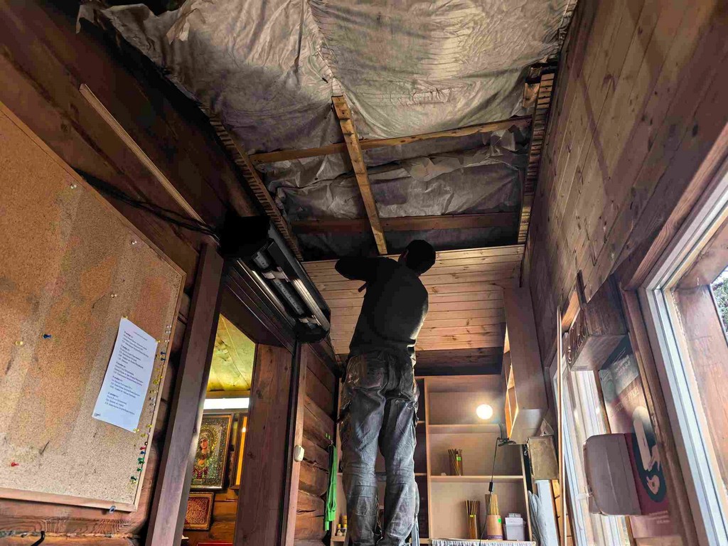 Благодаря общей помощи почти завершены работы по ремонту храма. Вставлены новые два окна, одно из которых оказалось разбитым при пожаре, проведены работы по замене обгоревшего потолка тамбура. Останется провести новую электропроводку и установить новый безопасный обогреватель.